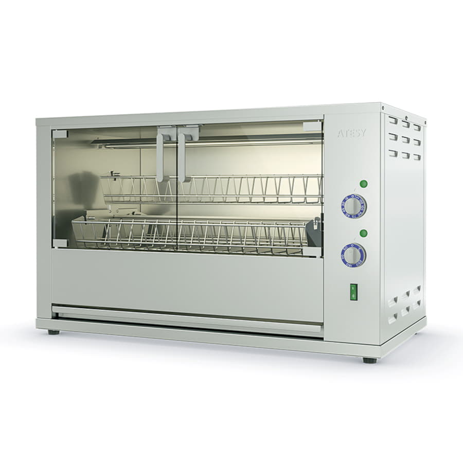 Гриль карусельного типа загрузкой до 12 кур. Куры размещаются внутри гриля на четырех легкосъемных садках (люльках), изготовленных из нержавеющего прутка. Садки вращаются вокруг центральной оси внутри рабочей камеры. Механизм торможения позволяет четко фиксировать положение садков во время остановки вращения, исключая проворот при несимметричной загрузке.