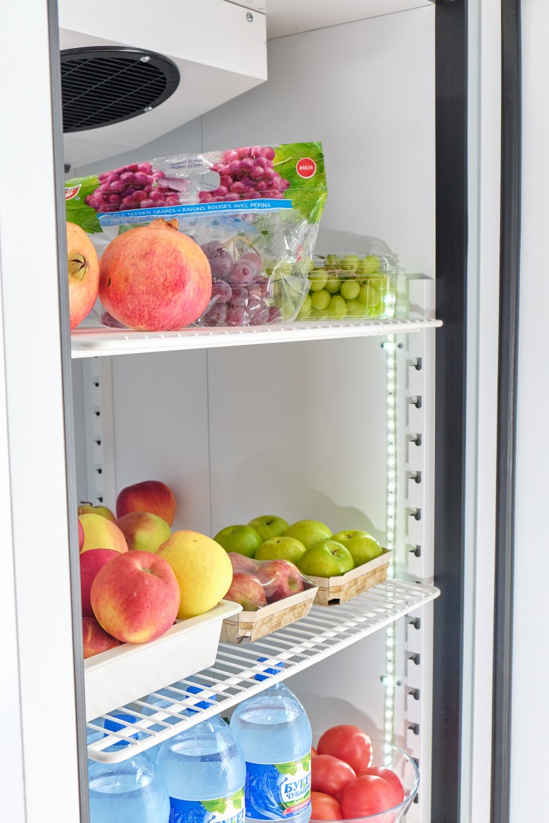 Внутри шкафа расположены четыре полки-решетки размером 545 на 488 мм, каждая из которых способна выдерживать нагрузку до 40 кг. Динамическая система охлаждения обеспечивает равномерное распределение температуры по всем полкам, а автоматическая оттайка с помощью ТЭНа упрощает обслуживание.