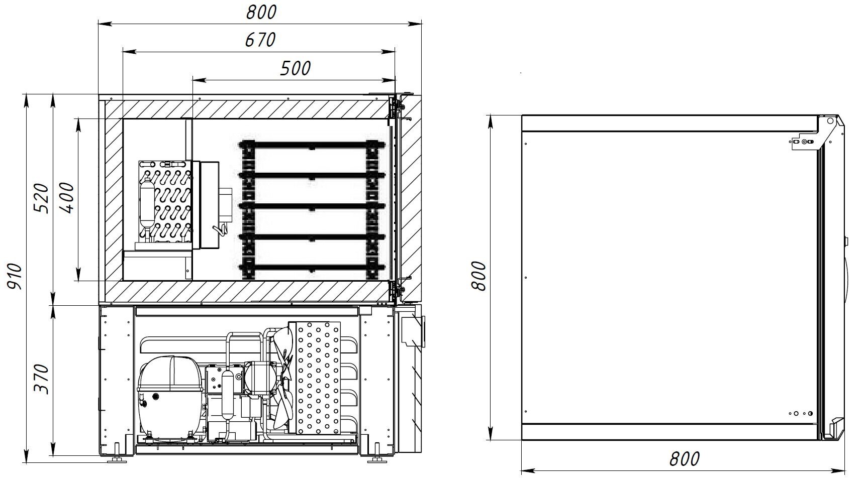 Шкаф оборудован нижним расположением агрегата и динамической системой охлаждения. Автоматическая оттайка осуществляется с помощью ТЭНов и системы испарения конденсата. Терморегулятор — электронный, а также предусмотрены ПЭН обогрева дверного проема и трубки слива конденсата. Суточный расход электроэнергии не превышает 6 кВт/ч.