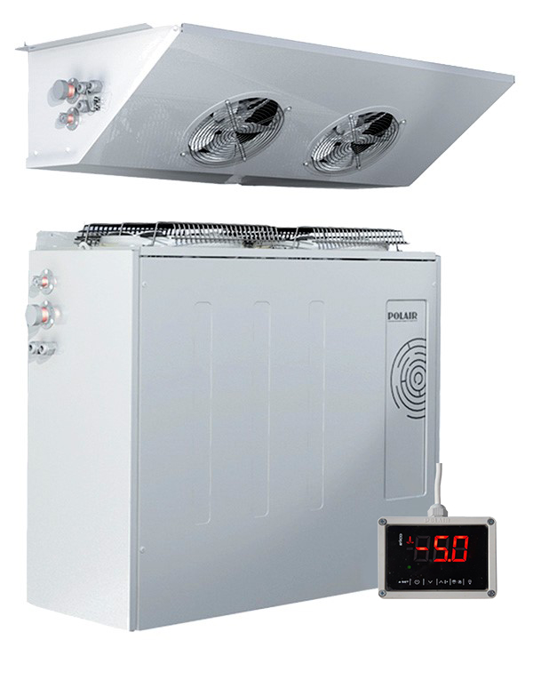 Кондесатор и воздухоохладитель имеют медно-алюминиевую конструкцию, с шагом ребра 3,2 мм и 3,6 мм соответственно. Общая площадь теплообменников составляет 11,14 м² и 8,93 м². Оба блока оборудованы двумя вентиляторами, обеспечивающими производительность 1200 м³/час. Дальность струи воздуха достигает 4 метров, что позволяет эффективно охладить пространство.
