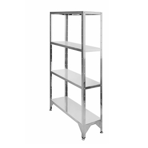 Конструкция включает четыре прочные полки и четыре стойки. Стойки изготовлены из оцинкованной, крашеной или нержавеющей стали, что гарантирует долговечность. Полки выполнены из пищевой нержавеющей стали AISI430, имеют ребро жесткости для дополнительной прочности и могут быть установлены на различных уровнях с шагом 96 мм, что позволяет адаптировать их под конкретные нужды.