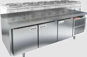 Регулируемые по высоте ножки и автоматические доводчики дверей с фиксатором открытого положения добавляют удобства в эксплуатации. Легкозаменяемые магнитные уплотнители обеспечивают надежную герметичность. Высота борта составляет 50 мм, что предотвращает случайное высыпание продуктов.