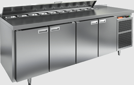 Объем данного устройства составляет 660 литров, что делает его вместительным для хранения различных ингредиентов. Холодильный агрегат расположен справа, а конструкция соответствует гастронормам, что упрощает организацию рабочего пространства. Стол выполнен из нержавеющей стали, что гарантирует долговечность и легкость в уходе.