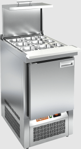 Объем данного устройства составляет 110 литров, а холодильный агрегат расположен в нижней части, что способствует эффективному использованию пространства. Стол соответствует гастронормам и имеет защитный борт, что предотвращает случайное падение продуктов. Работает от сети с напряжением 220 В и мощностью 150 Вт.