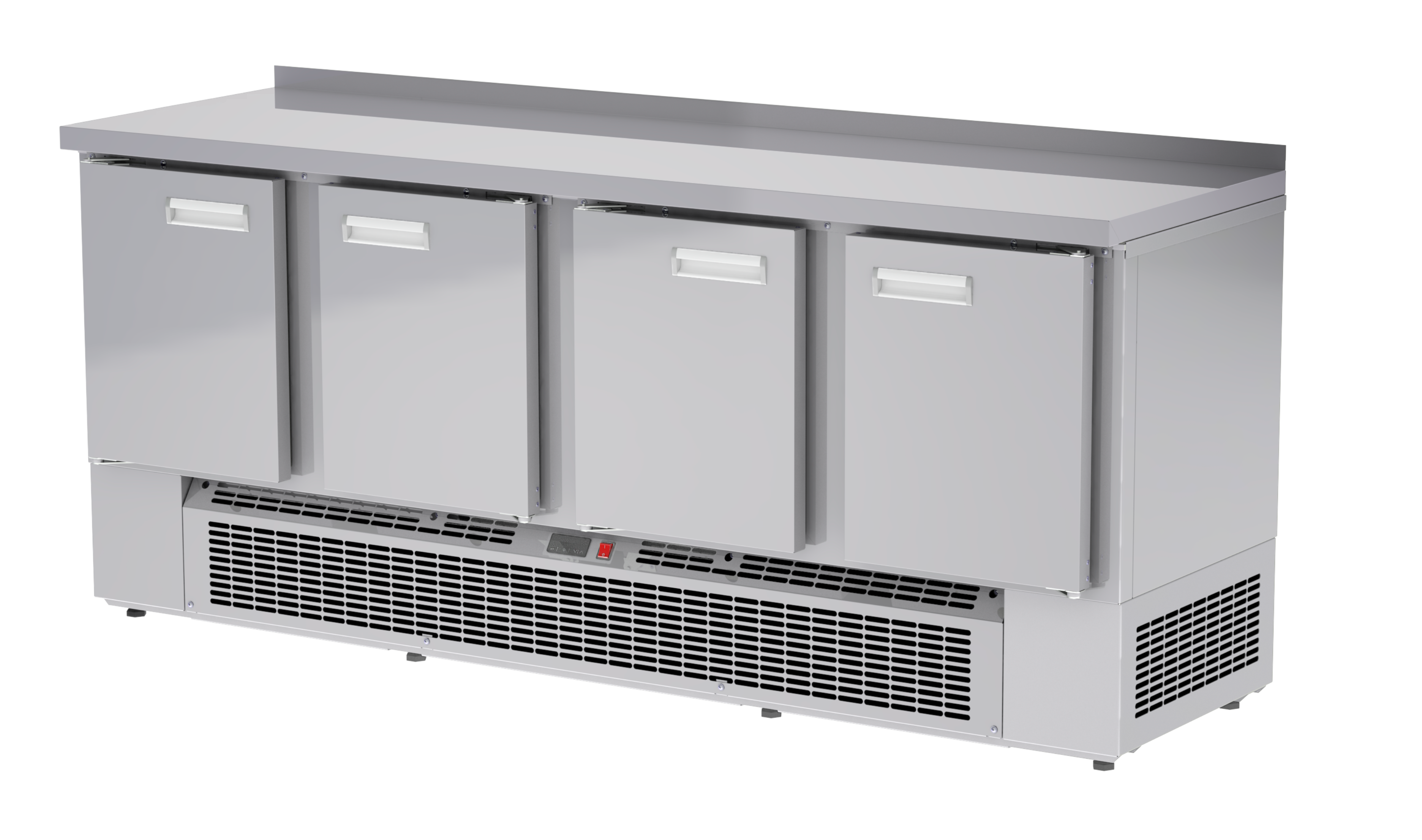 Холодильный агрегат расположен в нижней части устройства, что способствует оптимальному распределению температуры. Стол имеет гастронормированные размеры и оборудован бортом для предотвращения случайного высыпания продуктов. Напряжение питания составляет 220 В, а мощность устройства — 0,595 кВт.