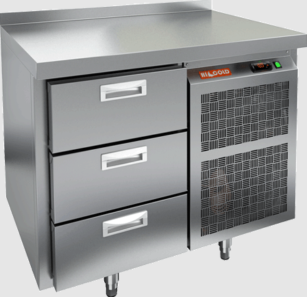 Объем морозильной камеры составляет 150 литров, что делает его идеальным выбором для профессиональных кухонь и предприятий общественного питания. Холодильный агрегат расположен справа, что обеспечивает оптимальное использование пространства. Стол соответствует гастрономическим стандартам, а наличие борта предотвращает случайное высыпание продуктов.