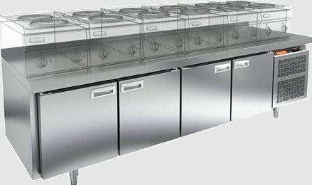 Холодильный агрегат расположен справа, а конструкция не имеет гастронормированных размеров. Стол оборудован бортом, что предотвращает случайное падение продуктов. Устройство работает от сети с напряжением 220 В и мощностью 0,66 кВт.