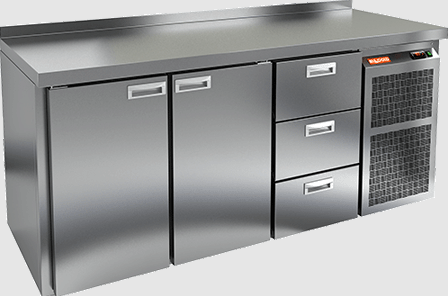 Холодильный агрегат расположен справа, а конструкция стола включает бортик, что предотвращает случайное падение продуктов. Устройство работает от сети с напряжением 220 В и мощностью 600 Вт, что делает его экономичным в использовании. Корпус и столешница выполнены из нержавеющей стали, что обеспечивает долговечность и легкость в уходе.