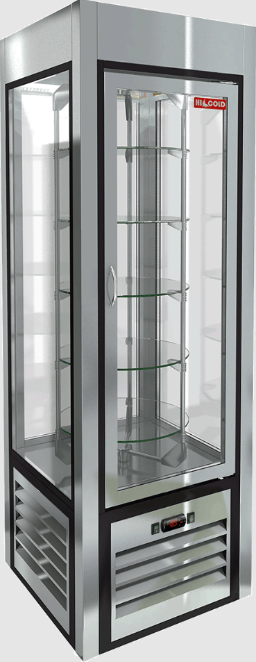 Регулируемые по высоте ножки и вращающиеся полки делают использование витрины ещё более удобным. Легкозаменяемые магнитные уплотнители и однокамерный стеклопакет обеспечивают надежную герметичность.